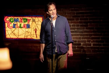Alex não é comediante desde o início. Ele se torna um. O palco surge como catarse após a separação de Tess. Porém, o roteiro compromete o realismo ao nunca mostrar seu outro trabalho. Ele cuida dos filhos durante o dia e faz stand-up à noite, mas não sabemos como sustentar essa rotina. Essa lacuna enfraquece a construção do personagem.